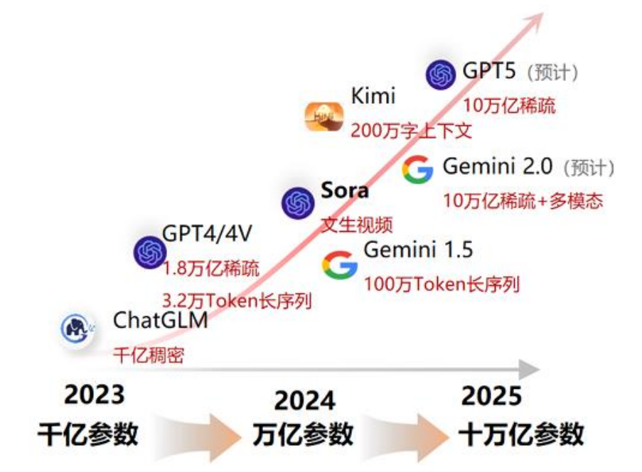 而当下,人工智能大模型的参数规模正从千亿级别向着十万亿级别快速迈进。以GPT模型为例,天风证券研报数据显示,GPT-4的参数规模已达1.8万亿,而2025年所发布的GPT-5其参数规模则预计将突破10万亿。