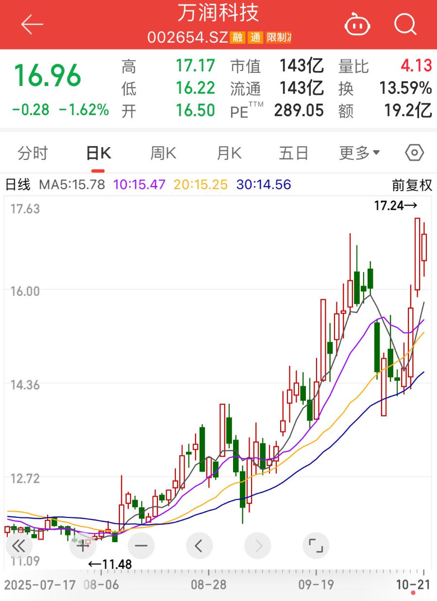 10月21日,万润科技(002654.SZ)低开震荡,截至9时58分报16.85元/股,跌幅2.26%。此前两个交易日(10月17日、20日),其股价累计涨幅超17%,其中20日更是强势涨停。