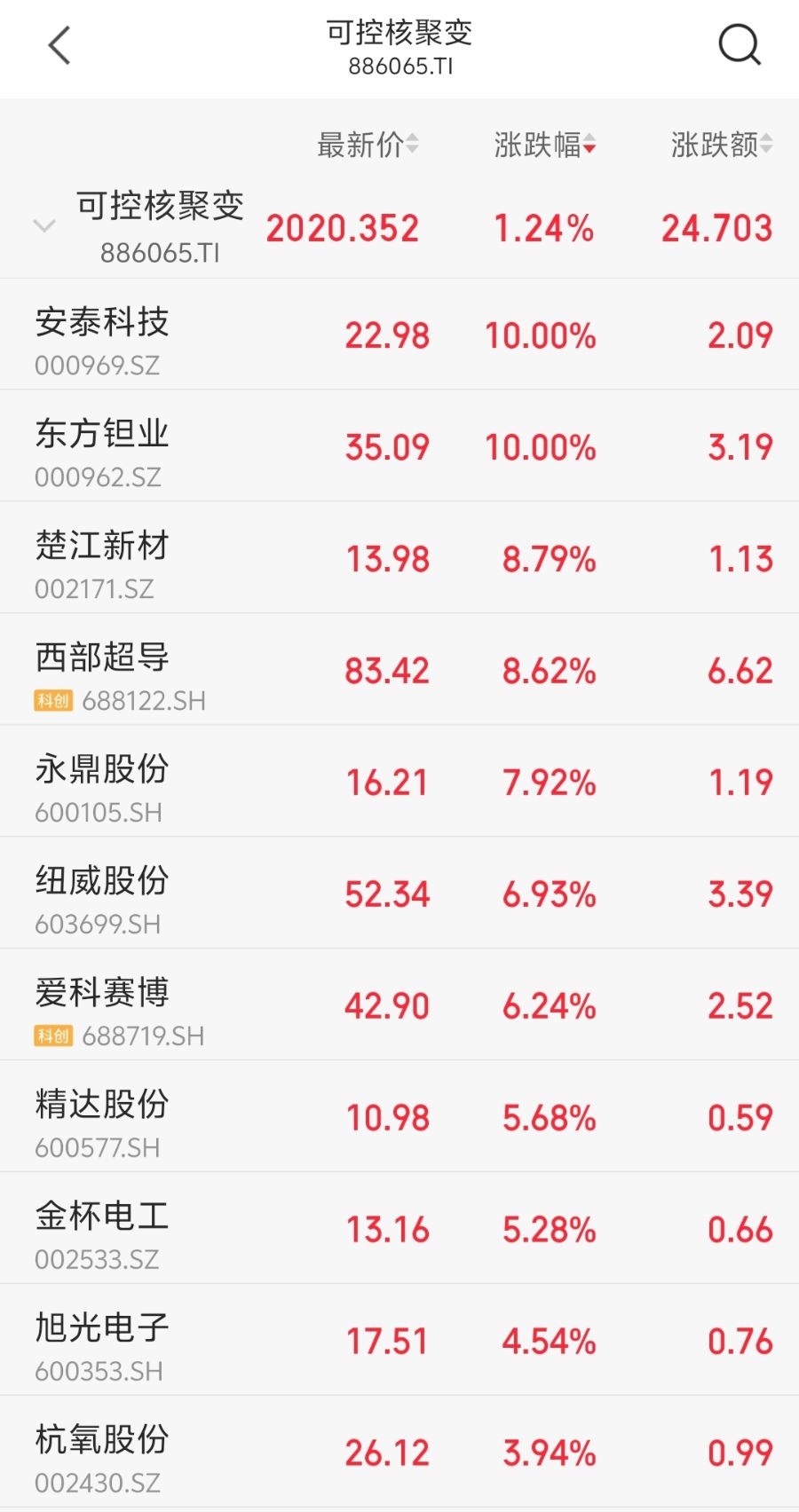 10月28日早盘,可控核聚变概念延续强势,安泰科技(000969.SZ)、东方钽业(000962.SZ)两连板,西部超导(688162.SH)、永鼎股份(600105.SH)等跟涨。