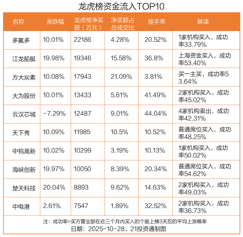 10月28日,上证指数下跌0.22%,深证成指下跌0.44%,创业板指下跌0.15%。盘后龙虎榜数据显示,共有45只个股因当日异动登上龙虎榜,资金净流入最多的是多氟多(002407.SZ),达2.22亿元。