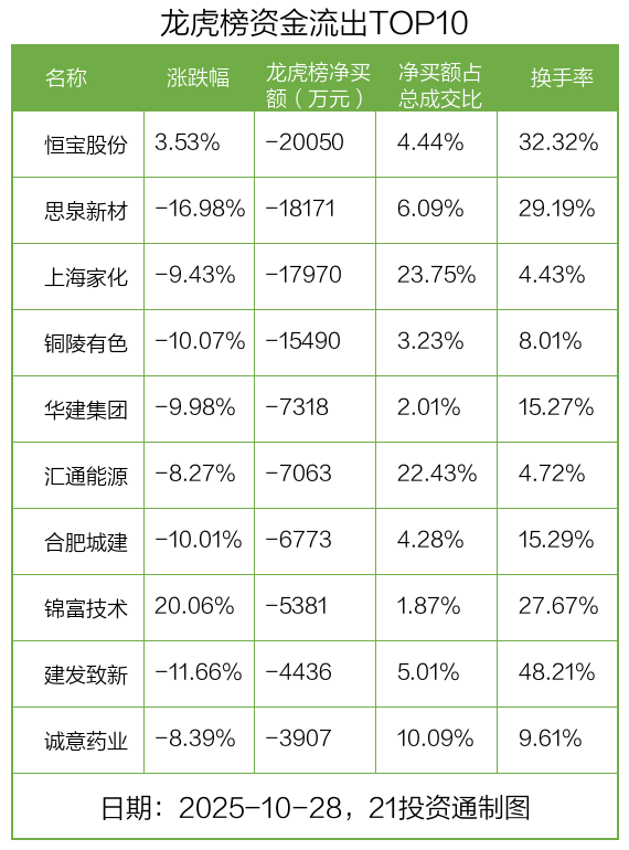 而龙虎榜中资金净流出最多的是恒宝股份(002104.SZ),被净卖出为2亿元,占总成交金额的4.44%。恒宝股份收盘上涨3.53%,换手率为32.32%。