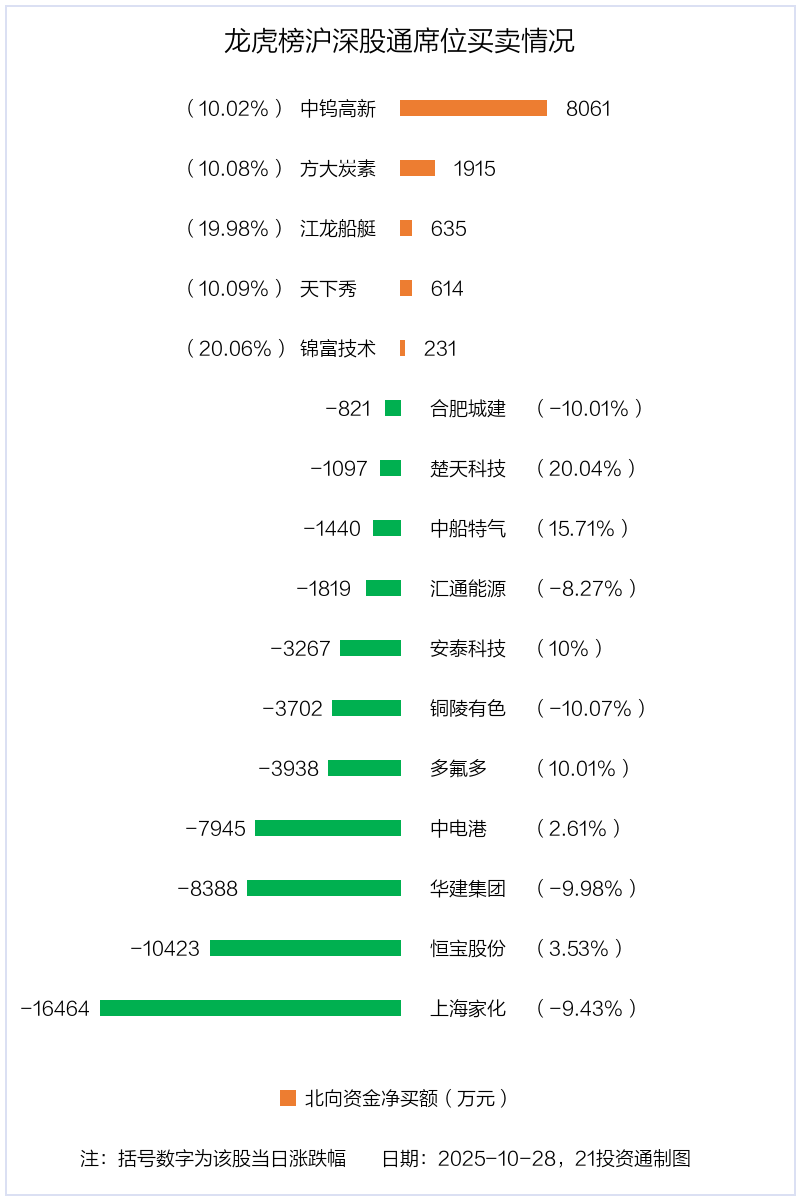 10月28日,北向资金参与龙虎榜中的个股共有16只,合计净卖出4.78亿元。其中沪股通净买入2 股,净卖出4 股,合计净卖出2.56亿元;深股通净买入3 股,净卖出7 股,合计净卖出2.23亿元。