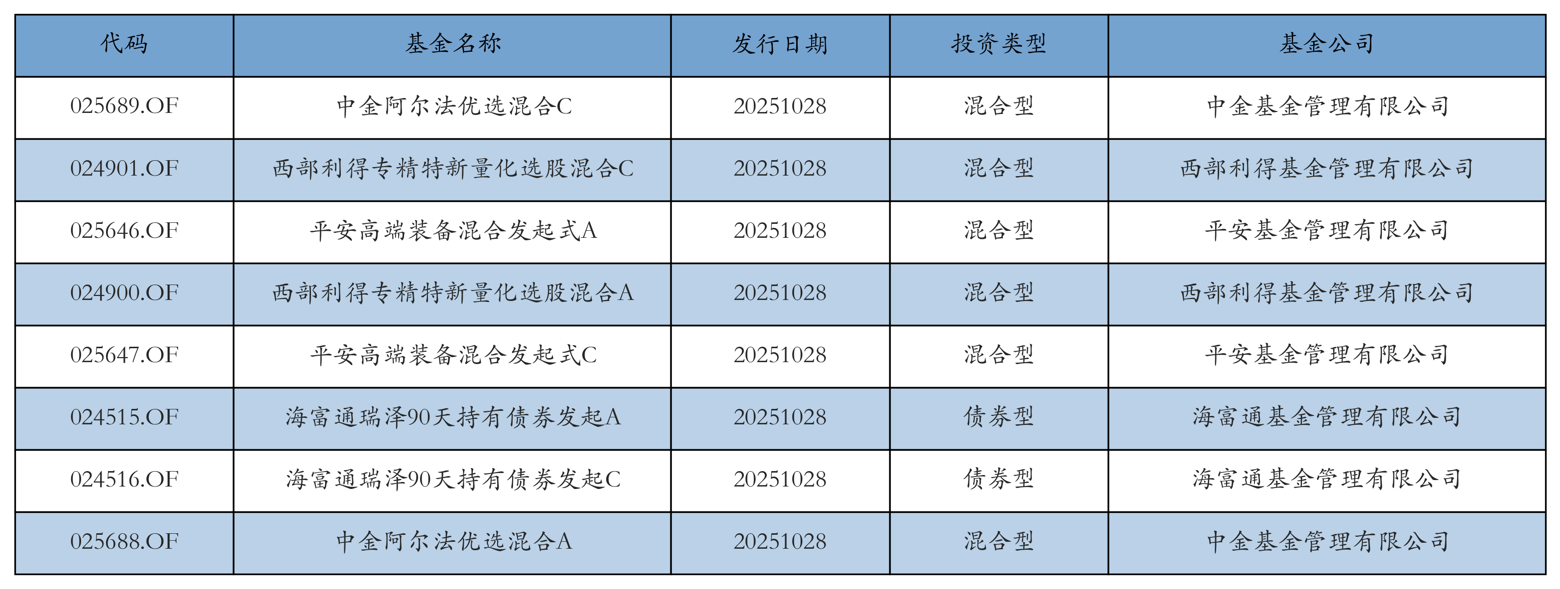 昨日有8只新基金发行,分别为:中金阿尔法优选混合C、西部利得专精特新量化选股混合C、平安高端装备混合发起式A、西部利得专精特新量化选股混合A、平安高端装备混合发起式C、海富通瑞泽90天持有债券发起A、海富通瑞泽90天持有债券发起C、中金阿尔法优选混合A,详情见下表: