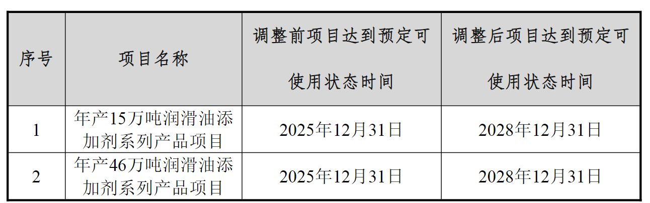 基于现有项目的产能利用率情况,瑞丰新材对在建产能的推进节奏作出调整。今年8月22日,公司发布项目延期公告,将“年产15万吨润滑油添加剂系列产品项目”及“年产46万吨润滑油添加剂系列产品项目”达到预定可使用状态的时间由原计划的2025年底推迟至三年后。