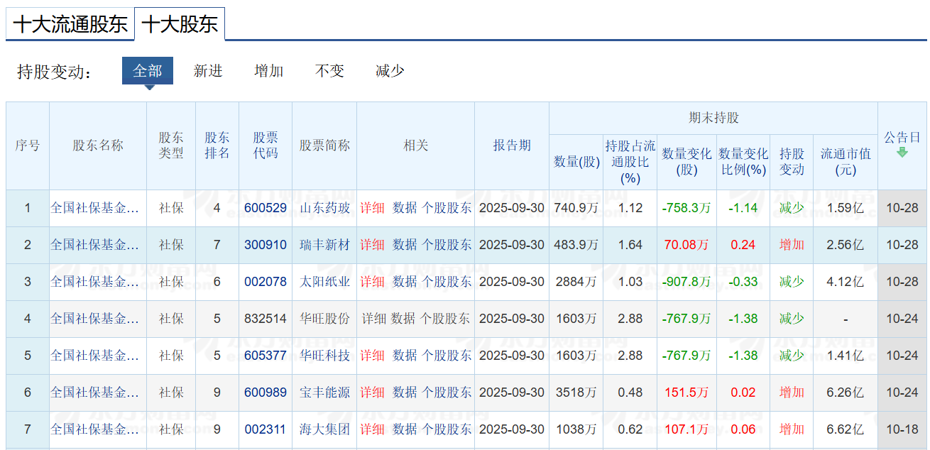 从投资逻辑来看,社保基金通常倾向于配置经营稳健、行业地位稳固的龙头企业。以三季度全国社保基金一零九组合的调仓动作为例,其在增持瑞丰新材的同时,也同步加仓了宝丰能源(600989.SH)与海大集团(002311.SZ),而另一方面则减持了山东药玻(600529.SH)、太阳纸业(002078.SZ)等短期业绩承压的标的。