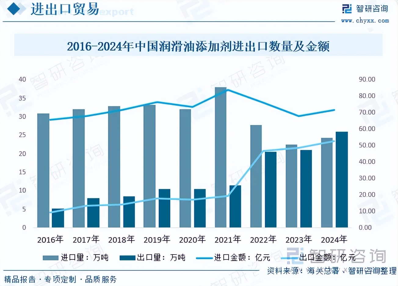 图片说明:2016-2024年中国润滑油添加剂进出口数量及金额,数据来源于海关总署、智研咨询