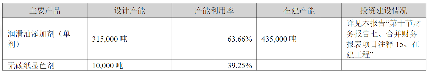 近年来,瑞丰新材产能扩张步伐较快。现有产能31.5万吨,在建产能43.5万吨,合计规划产能超过70万吨。但2024年公司润滑油添加剂产能利用率仅为63.66%,低于市场预期。