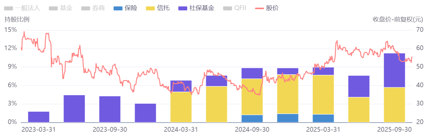 除了产业资本的深度布局,以信托、保险及社保基金为代表的中长期资金也在持续加大对瑞丰新材的配置。2024年,信托与保资率先增持该股;今年二三季度,全国社保基金也加入增持行列,进一步强化了中长期资金对公司的关注态势。自2023年一季度进入瑞丰新材前十大股东以来,尽管社保基金的具体组合有所调整,但其始终未退出前十大股东之列,持股比例还有所增加。