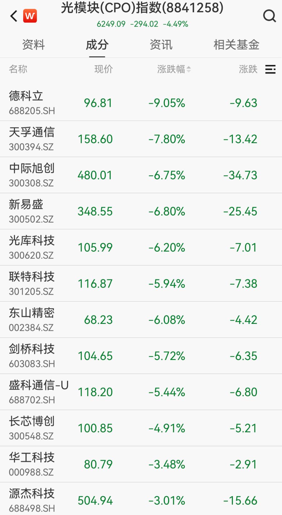 10月31日,A股光模块板块大幅回调,被称为“易中天”的光模块“三巨头”新易盛(300502.SZ)、中际旭创(300308.SZ)和天孚通信(300394.SZ)集体下挫。截至当天11时05分,天孚通信跌幅达7.8%,中际旭创下跌6.75%,新易盛下跌6.8%。