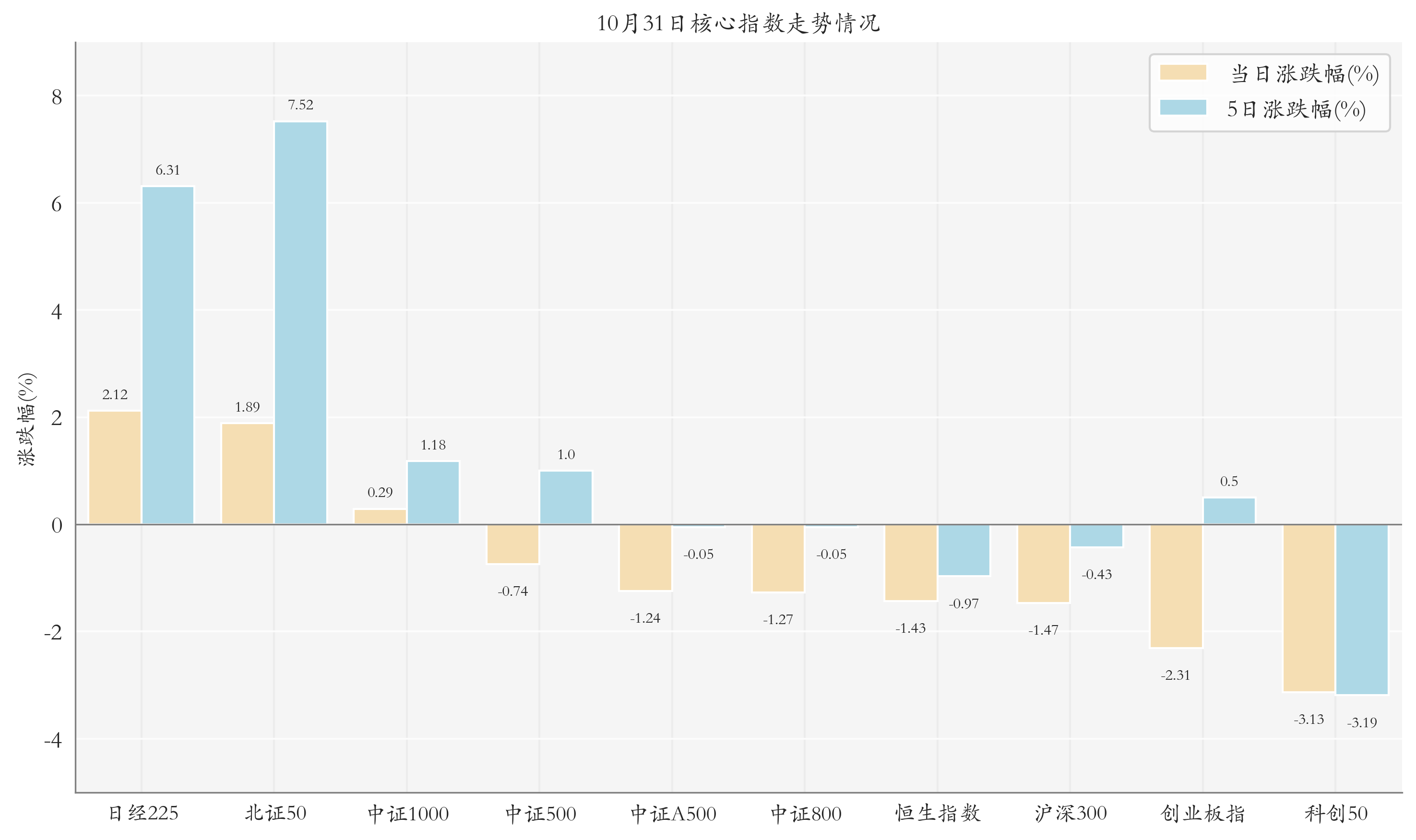 统计A股与海外主要核心指数走势,今日(10月31日,下同)三大指数集体下跌,其中上证指数下跌0.81%,收于3954.79点,日内最高3986.74点;深证成指下跌1.14%,收于13378.21点,日内最高13618.15点;创业板指下跌2.31%,收于3187.53点,日内最高3281.66点。今日日经225、北证50与中证1000走势排名靠前,日涨跌幅分别为2.12%、1.89%与0.29%;近5个交易日北证50、日经225与中证1000的走势排名靠前,近5日涨跌幅分别为7.52%、6.31%与1.18%。