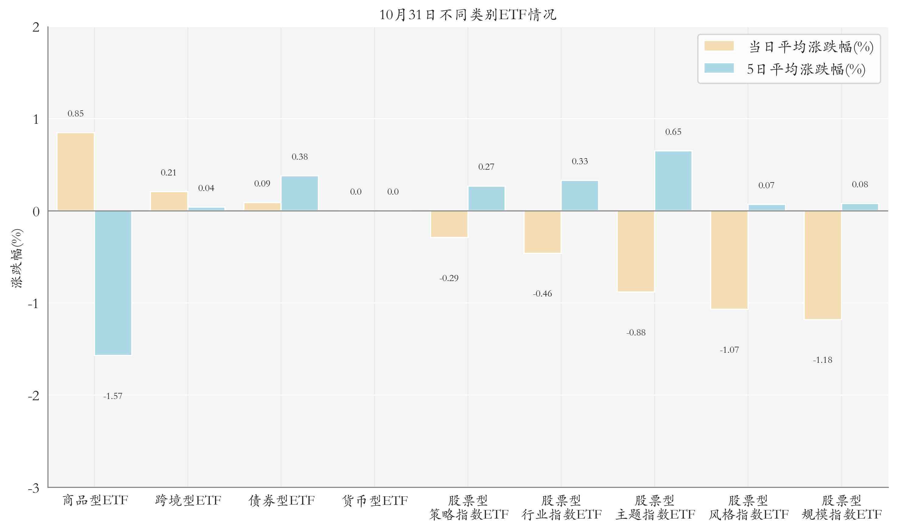 根据ETF基金的投资范围,将ETF基金划分为股票型规模指数ETF、股票型行业指数ETF、股票型策略指数ETF、股票型风格指数ETF、股票型主题指数ETF、债券型ETF、商品型ETF、货币型ETF、跨境ETF,今日商品型ETF表现最优,该类ETF的平均涨跌幅为0.85%;股票型规模指数ETF的表现最差,该类ETF的平均涨跌幅为-1.18%。