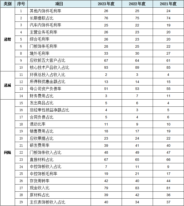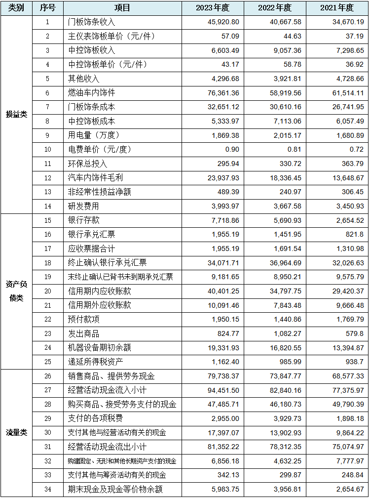 从上表可见,也如上文所述发行人虽然在营业收入总数上没有表现出规律性变化,但发行人占比最高的门板饰条各年度收入分别为34,670.19万元、40,667.58万元、45,920.80万元,该三个数依次分别为3.5亿元、4.0亿元、4.5亿元的近似数,也即发行人核心产品收入存在较为明显的每年递增5,000万元的规律性变化……如上表中所示,发行人合计存在14项损益类数据的规律性变化,11项资产负债表类数据规律性变化,甚至还存在9项流量表数据的规律性变化,合计约34项报表级财务数据规律性变化。而此处所说的报表级财务数据是指以直接构成会计报表的一级科目为主,招股书中二级会计科目及以下科目的规律性变化数据,比如并不在少数的二级科目期间费用的数据规律性变化,并不在上表统计之列。