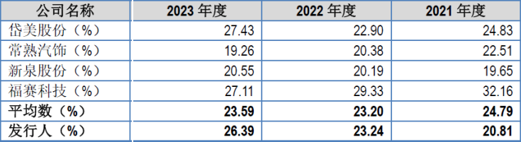 从上表可见,发行人依次实现毛利率20.81%、23.24%、26.39%,从2021年度绝对值低于24.79%的行业平均值约3%左右,至2022年度与23.20%行业平均值几乎相持平,再至2023年度超过23.59%的行业平均值约3%左右。发行人在毛利率可比的核心指标上,几乎实现从略低于到持平再实现微反超的相当精准变化过程。