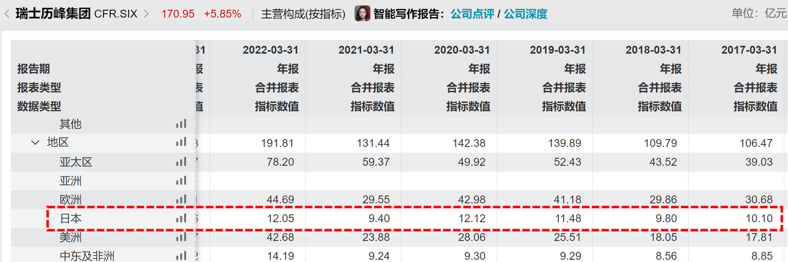 图片说明:历峰集团2017FY~2022FY日本地区收入,数据来源于Wind