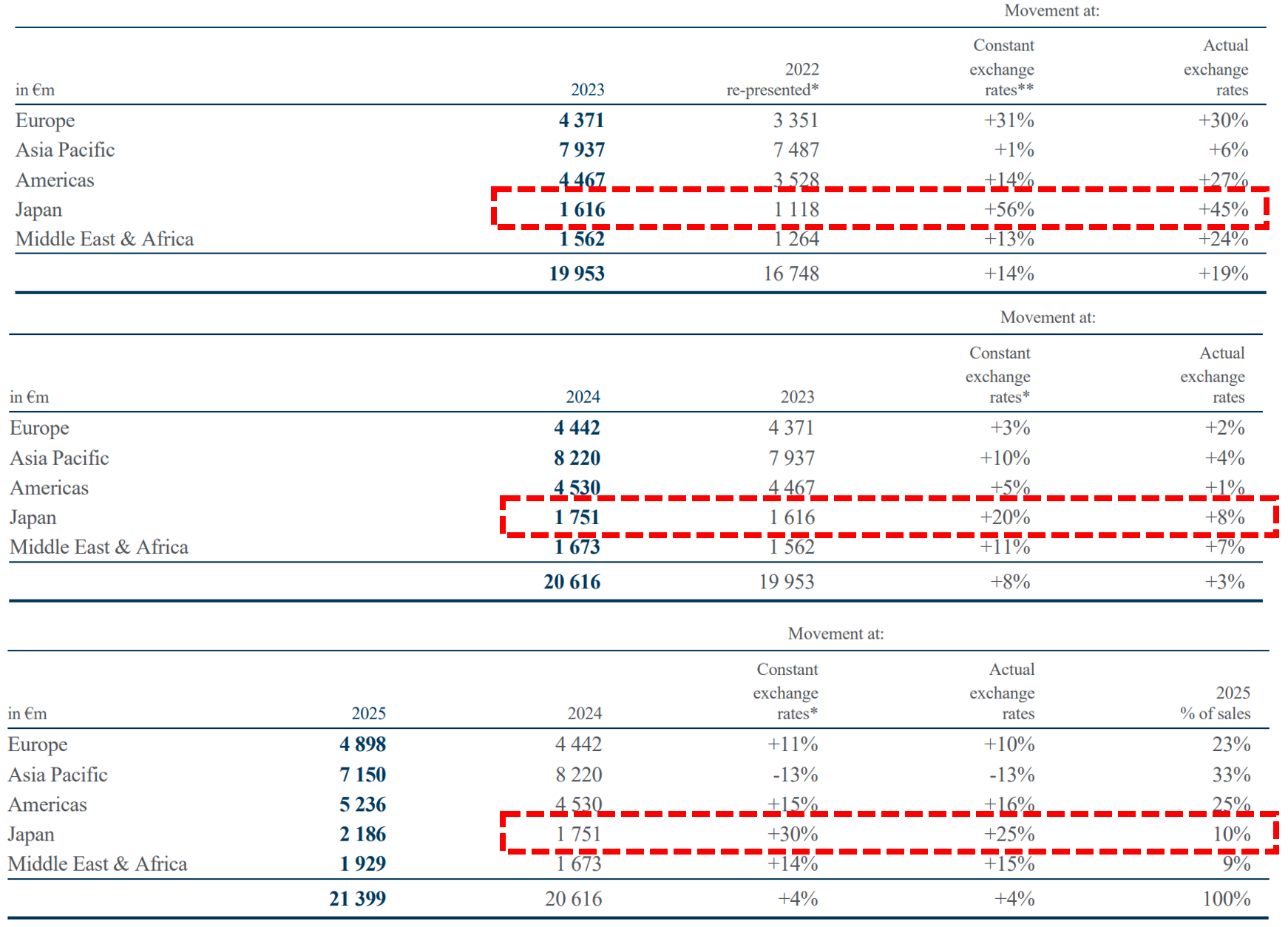 例如,通过历峰集团(旗下拥有卡地亚、梵克雅宝、江诗丹顿、万国、朗格、积家等品牌)的财报,可以看到,2023财年(以3月31日为一个财年起点和终点)之前,历峰集团在日本市场的销售额增速非常缓慢,近似等于一个存量市场,从2017FY到2022FY,销售额由10.10亿欧元提高到12.05亿欧元,CAGR仅3.59%,是历峰集团收入增速最低的地区。