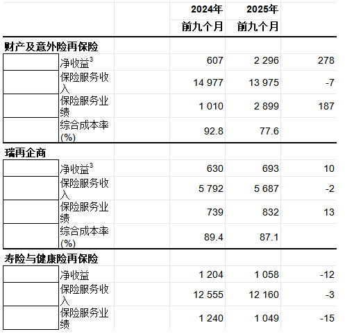 2025年前九个月,瑞士再保险集团净收益为40亿美元,ROE为22.5%,2024年同期净收益为22亿美元(3),ROE为13.3%(4)。净收益增长主要得益于财产及意外险再保险承保利润的大幅提升。