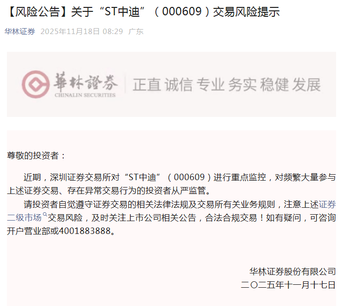 需要注意的是,当前ST中迪的异常交易行为已引起监管机构的高度关注。据多家券商披露,深圳证券交易所已明确指出,ST中迪股价短期内剧烈波动,已经被列入重点监控证券名单,对频繁大量参与上述证券交易、存在异常交易行为的投资者从严监管。