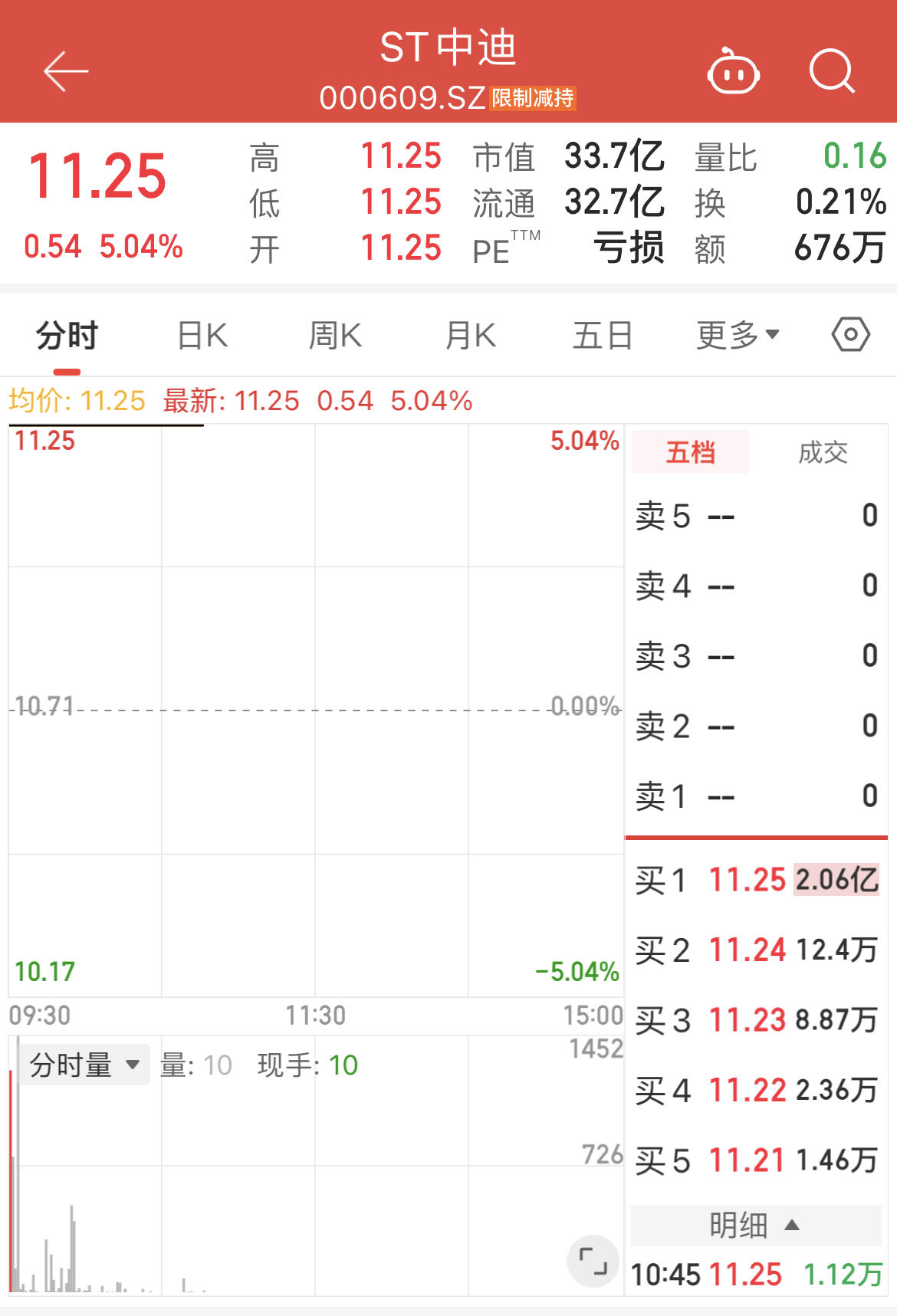 11月18日,“大牛股”ST中迪(中迪投资 000609.SZ)在完成停牌核查后复牌,再度迎来一字涨停,截至10时46分,报11.25元/股,封板资金达2.06亿元,这已是该股连续第20个交易日涨停,总市值攀升至33.7亿元。