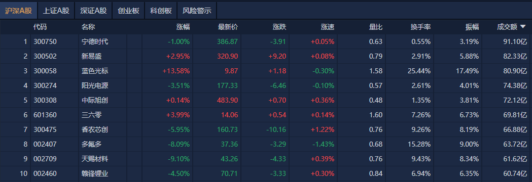 个股方面,宁德时代成交额超91亿元居首,新易盛、蓝色光标、阳光电源成交额靠前。