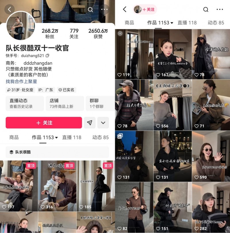 从拿货转向自制模式,队长很酷的产品品质和货源保障实现了第一次跨越式升级。2025年,张丹看到了快手平台上大量高消费力客群背后的高端市场商机后再次升级,从中端转向高端女装路线,以独特性、高品质产品,快速拉高客单价和利润空间,降低售后时间成本。