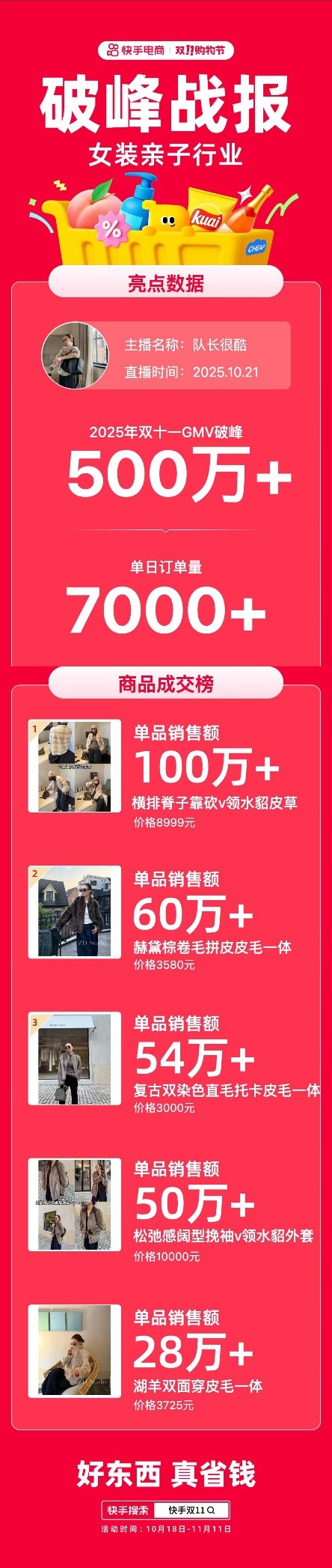 (原标题:高客单价女装带动销售破峰,队长很酷快手双11大场GMV超500万)