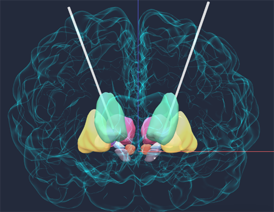图3:术后手术计划系统重组的3D效果图显示,双侧8触点STN+SNr位置放置“10环”!