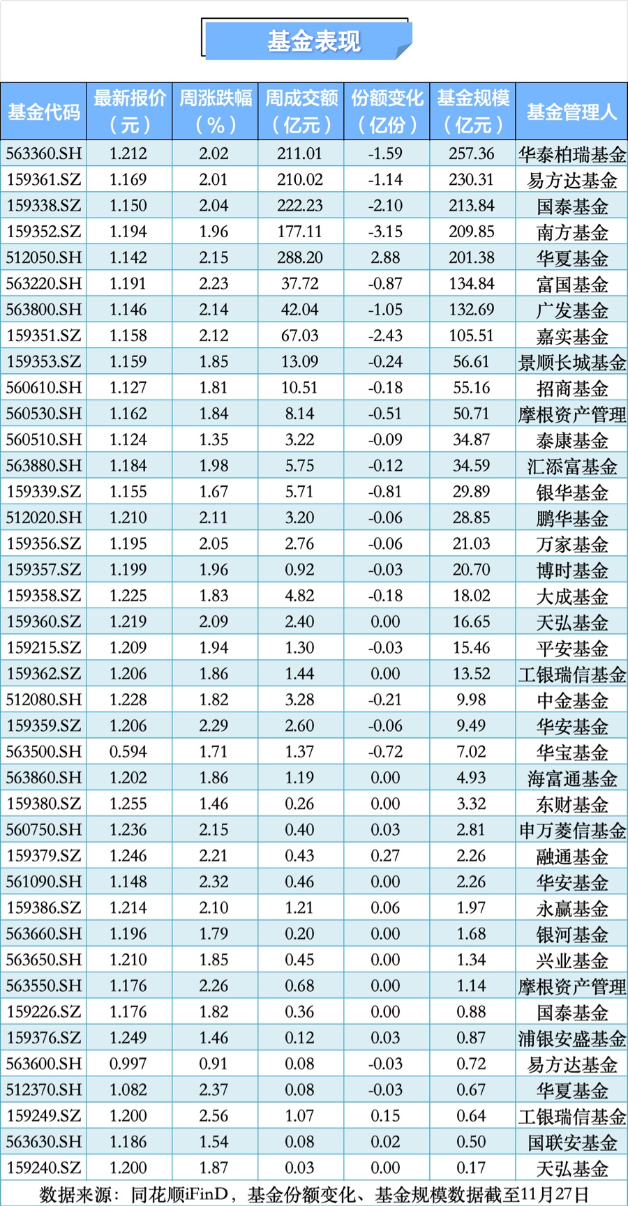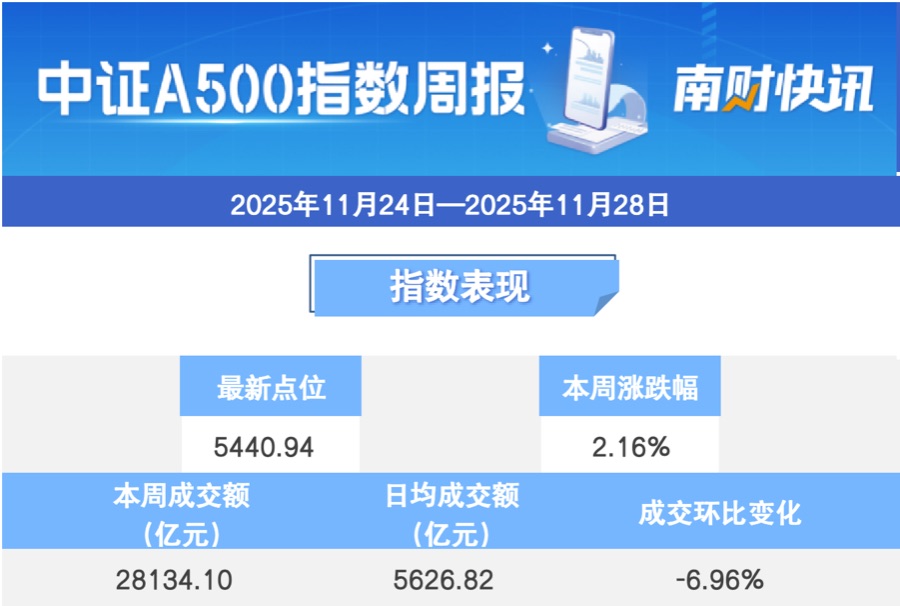 本周中证A500指数上涨2.16%,截至11月28日收盘,报5220.94点。本周日均平均成交额为5626.82亿元,单日成交额环比下降6.96%。