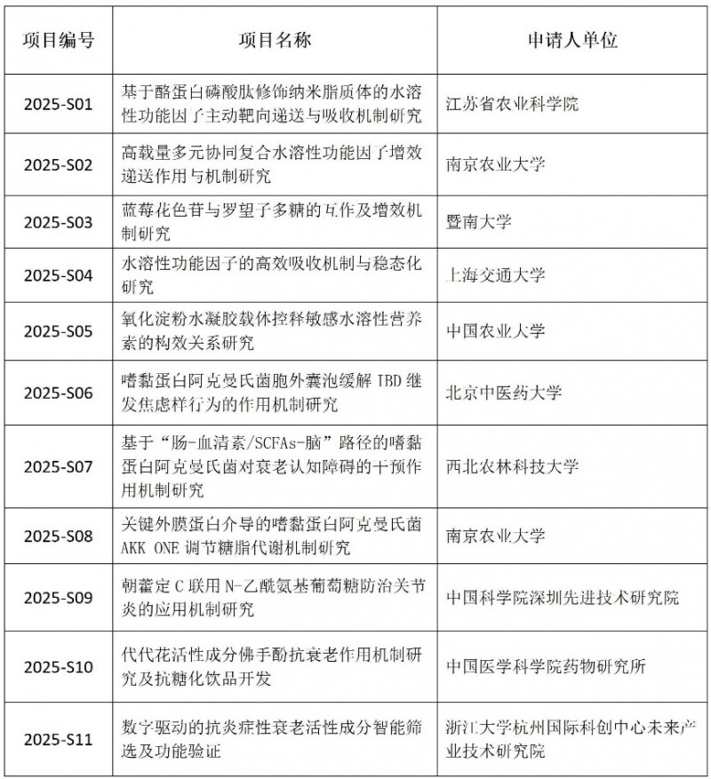 本次评审工作吸引了来自中国科学院深圳先进技术研究院、上海交通大学、浙江大学、中国农业大学等国内多家知名科研机构和院校的高度关注与踊跃申报,最终11项具有前瞻性的科研课题脱颖而出。该批项目聚焦营养健康领域的核心挑战,旨在通过支持前沿基础研究,为产业技术升级与产品创新提供关键科学支撑。