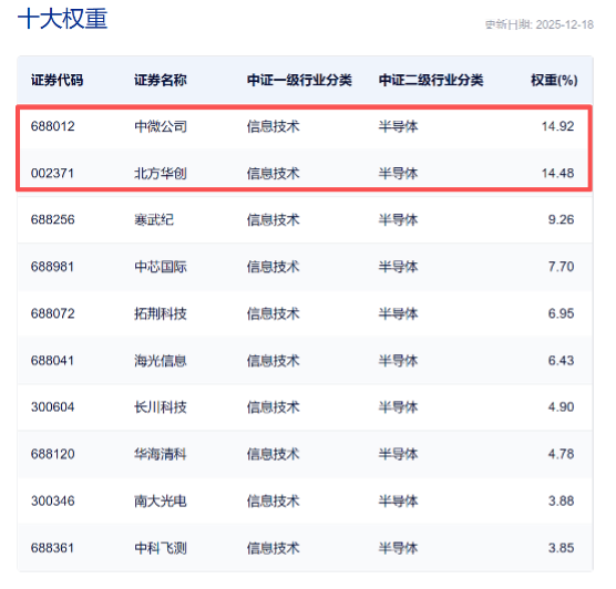 中证指数官网数据显示,半导体设备ETF(561980)跟踪中证半导,标的指数中半导体设备含量超5成,覆盖中微公司、北方华创、寒武纪、中芯国际、海光信息等各大细分龙头,前十大集中度将近8成。