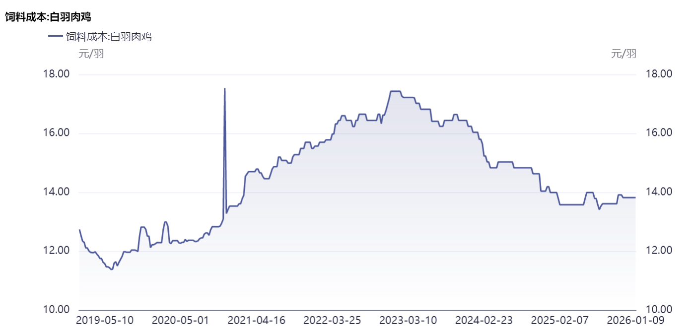 图片说明:白羽肉鸡饲料成本,数据来源于同花顺