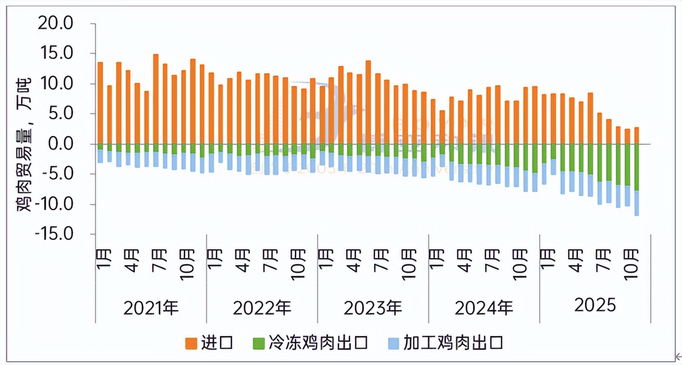 图片说明:2021-2025年(11月)我国鸡肉进出口量,数据来源于博亚和讯