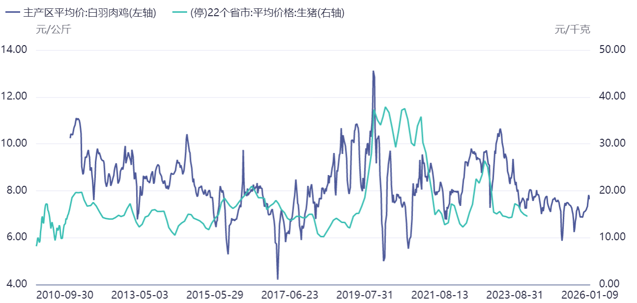 其次则需关注需求端变量。从畜牧业大周期视角看,国内生猪价格行情能否启动是重要观察窗口。从历史规律观察,生猪价格的变动是影响白羽肉鸡中短期行情的关键催化剂。历史上行业最具爆发力的上涨阶段,往往源于“猪鸡共振”效应的驱动。