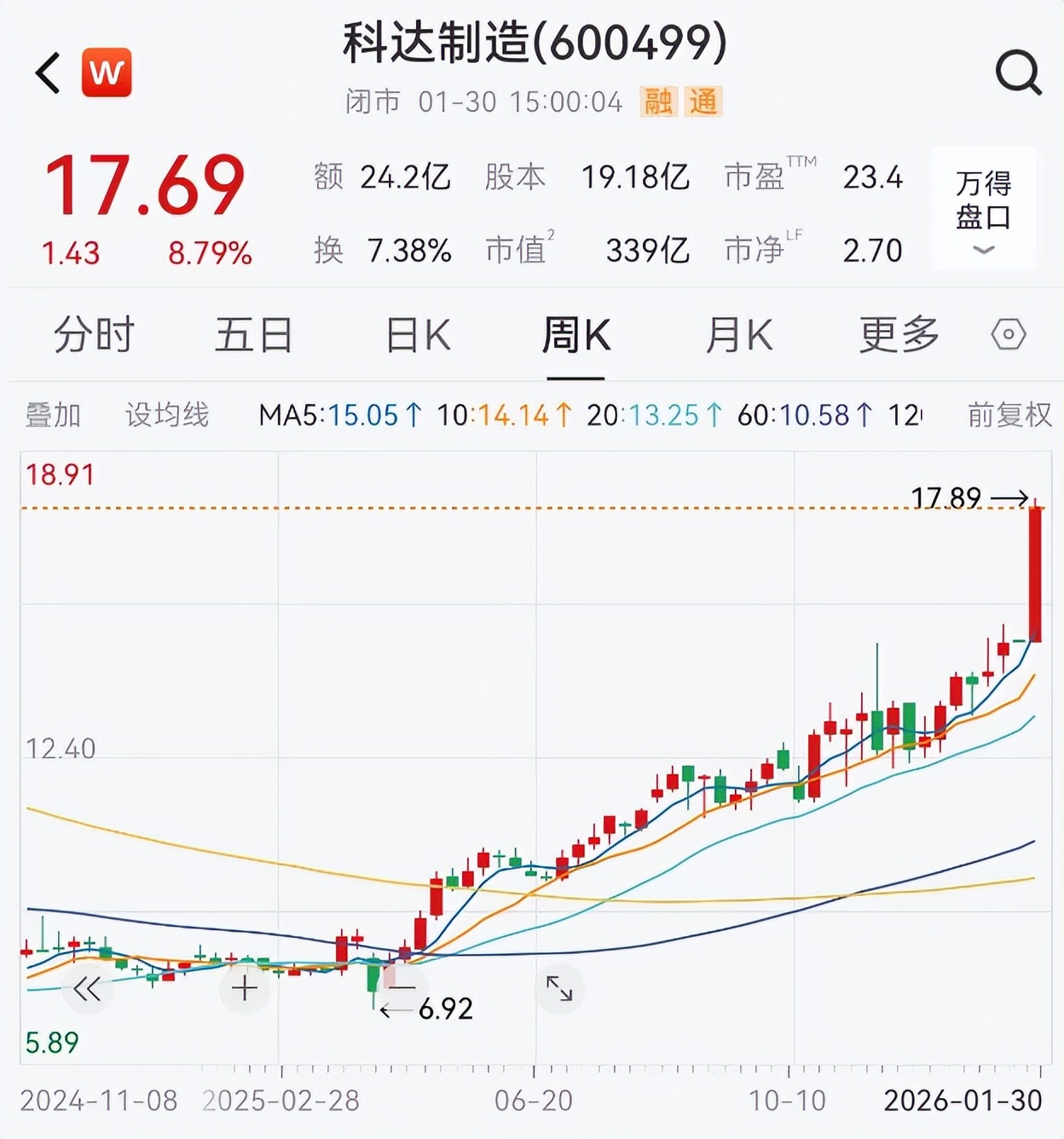 随着重大资产重组方案的披露,1月29日科达制造(600499.SH)复牌后涨停,1月30日进一步放量大涨8.79%,收盘后总市值来到339亿元,PE(TTM)约23.4倍。