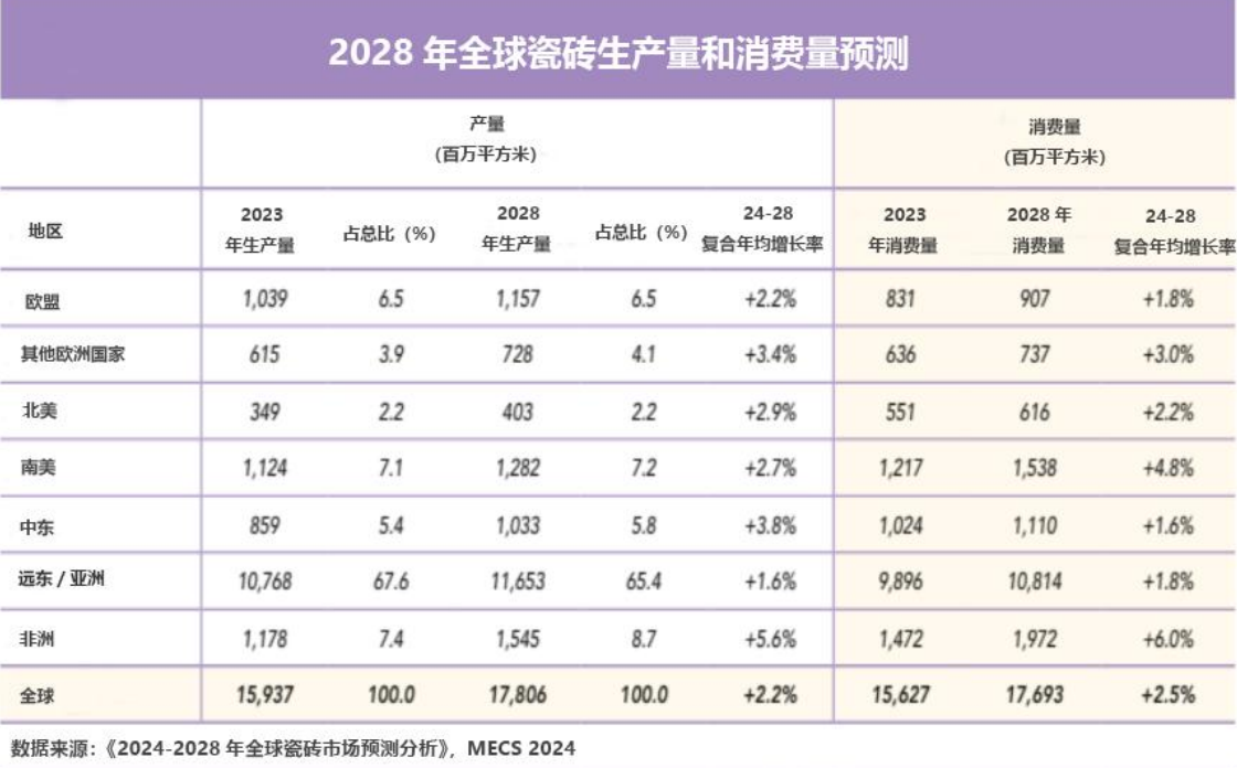 图片说明:2024~2028年全球瓷砖生产和消费预测,数据来源于公司2025半年报