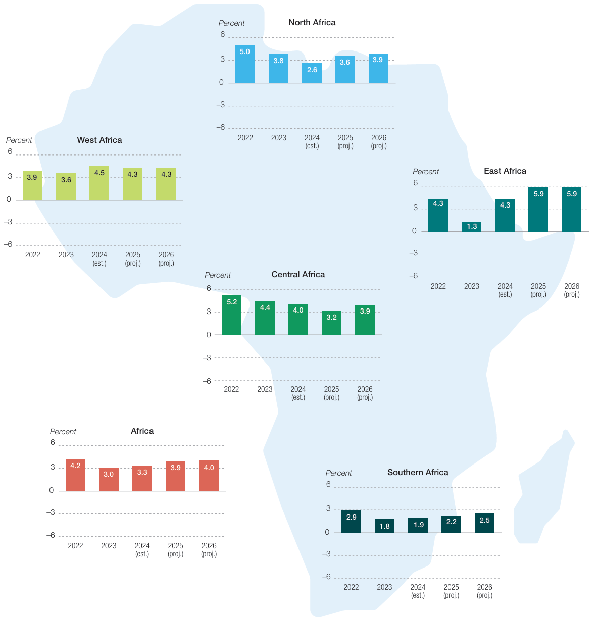 图片说明:非洲各地区增长表现及展望(百分比),数据来源于非洲开发银行集团