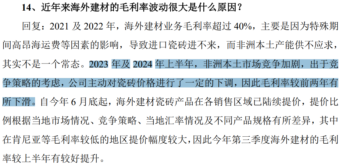 是因为非洲市场一片蓝海、缺乏充分竞争吗?熟悉科达制造的投资者或许比较了解,科达制造过去非洲建材业务的毛利率其实并不稳健,因为非洲瓷砖市场的竞争并非蓝海一片,尤其从2023年开始,竞争对手们向非洲瓷砖市场大量出口,价格战打的也非常惨烈,科达制造非洲建材业务毛利率从过去的40%+,在2023年和2024年分别下滑到35.70%和31.20%。