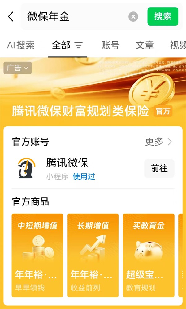▲在微信内搜索“微保年金”,即可直达产品集合页面