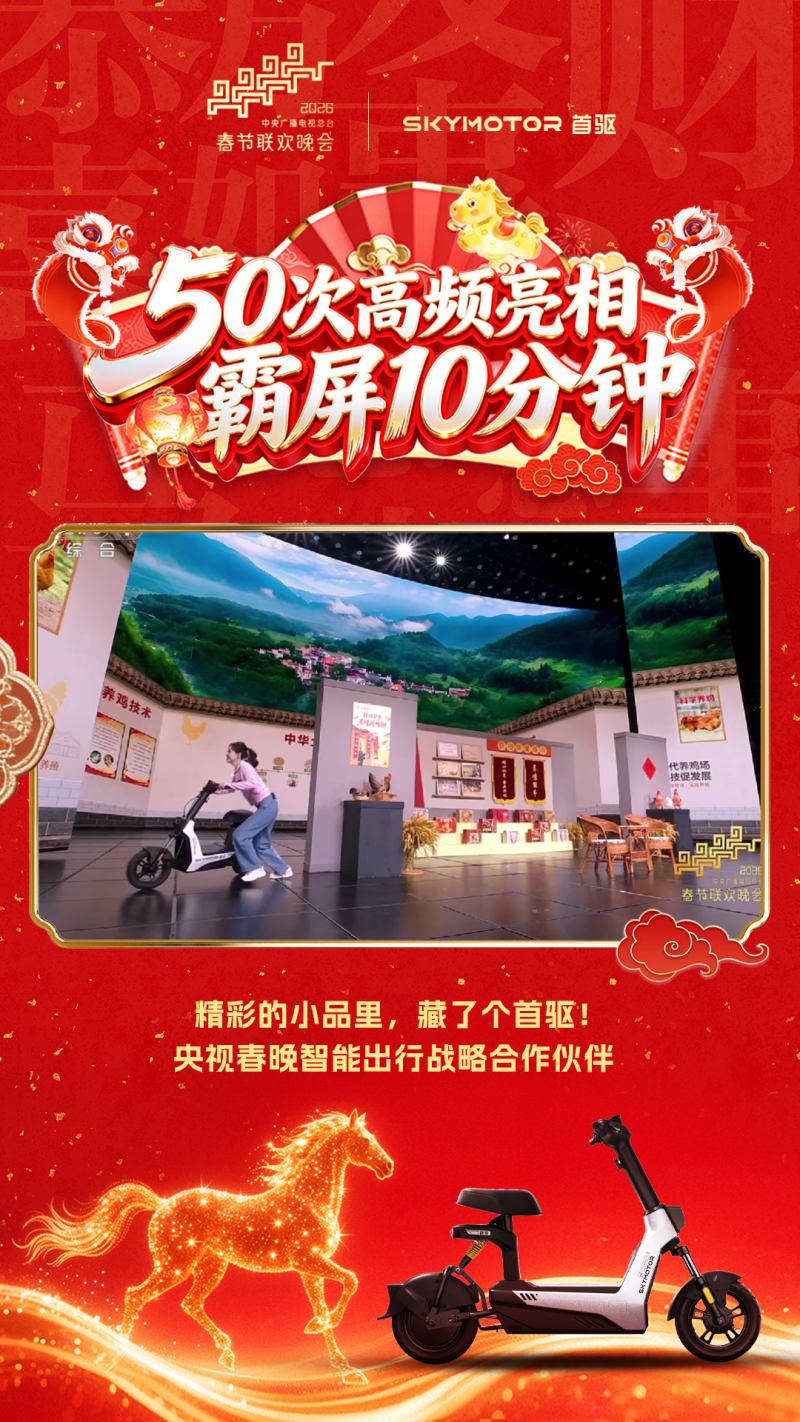 2026年除夕夜,首驱科技以“智能出行战略合作伙伴”身份亮相央视春晚。这是两轮电动车品牌首次进入春晚主舞台的合作序列,也是春晚创办四十余年来对智能出行赛道的首次战略卡位。一个成立仅一年的企业,为何能获得国家级平台的信任票?答案,需要从国家战略方向、企业核心能力以及产业代际更替三个维度来理解。