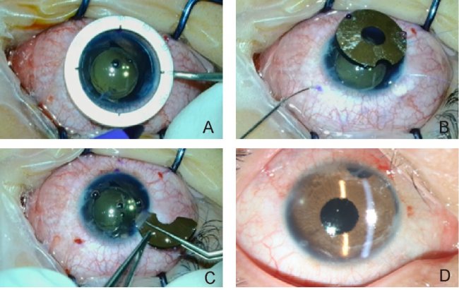 人工虹膜植入手术步骤(A)将人工虹膜环钻至合适直径,并确保伪瞳孔居中(B)在将装置植入眼内之前预置缝线(C)用镊子将装置植入(D)将人工虹膜缝合固定于巩膜壁