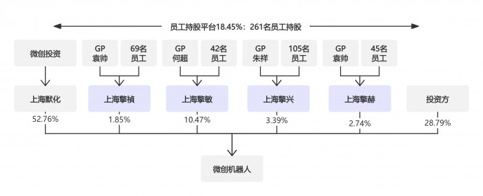 微创机器人的股权架构深度绑定母公司微创医疗的资源优势,上市前便搭建了4个员工持股平台,合计持有公司18.45%的股份,形成母公司加持背景下的「核心团队控股+员工持股」的结构。