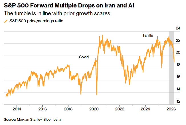 中东战争与AI担忧推动标普500预期市盈率回落,此次下跌走势与以往增长恐慌阶段相一致
