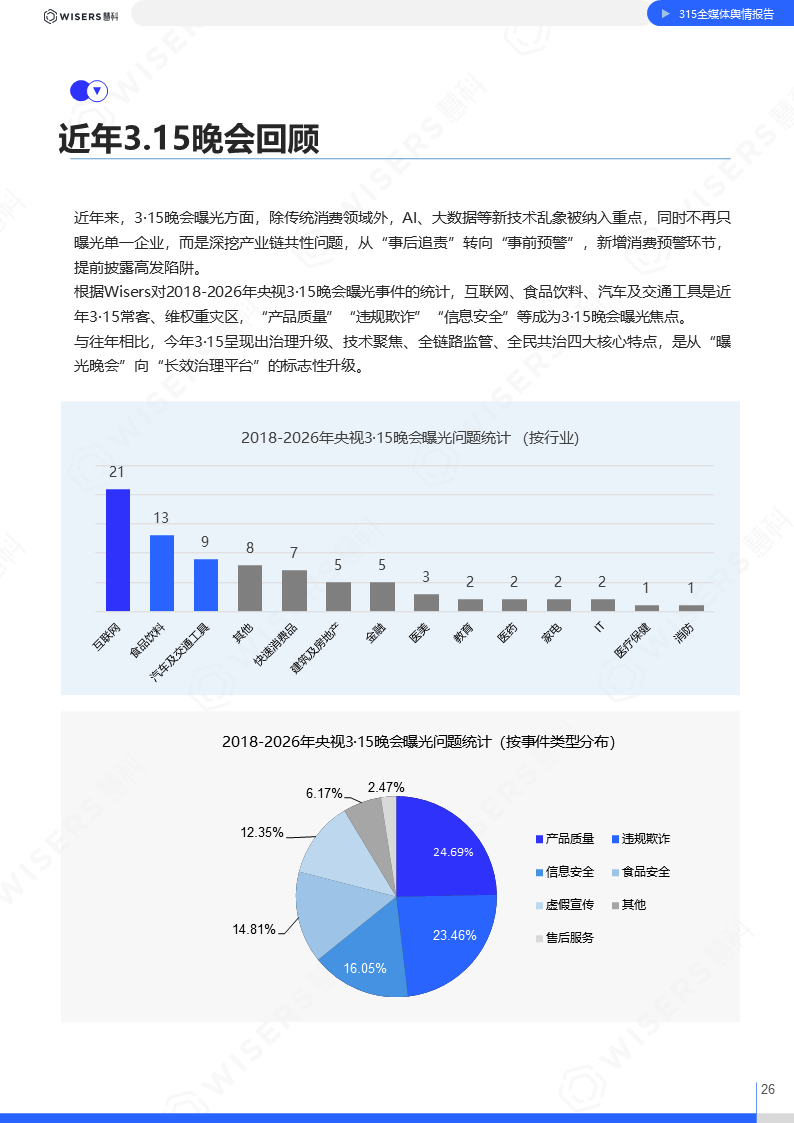 慧科讯业Wisers基于全网数据,发布《2026年315全媒体舆情分析与品牌洞察报告》(以下简称“《2026年315洞察报告》”)。《2025年315洞察报告》对2026年“3·15”晚会进行全媒体舆情分析,并对曝光事件展开分析洞察,同时对历年315数据进行回顾,为各大品牌方提供风险管理及危机应对建议。