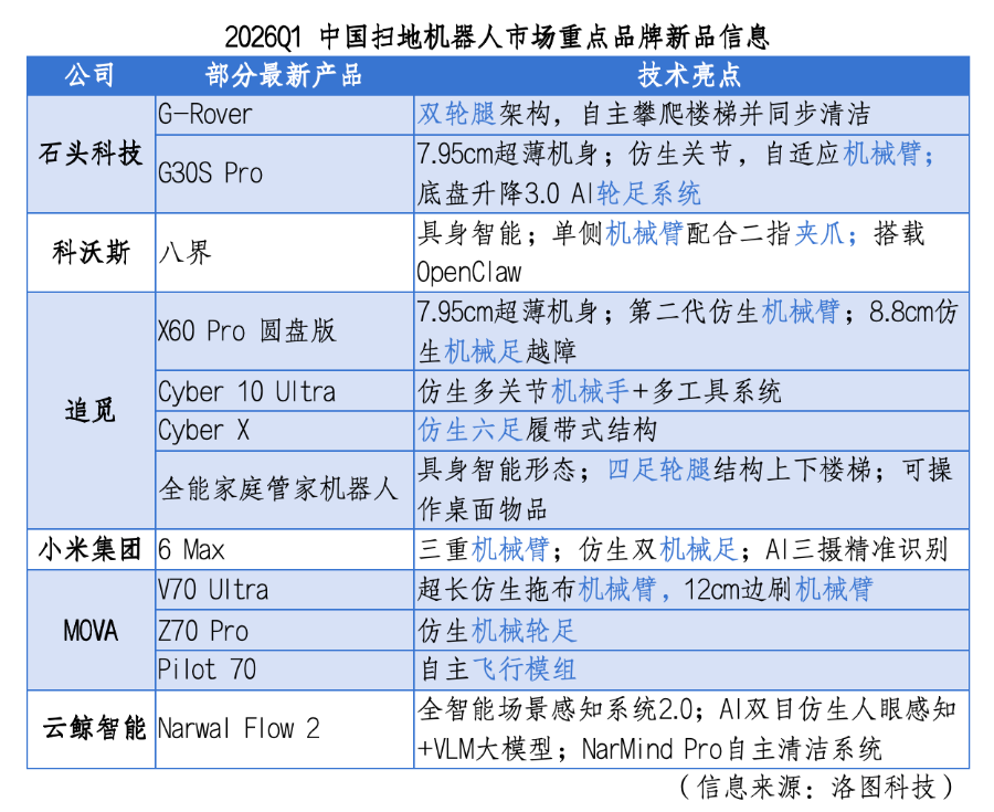 二者并非个例。就在4月,洛图科技梳理了2026年一季度中国扫地机器人的新品信息。从中不难看出,中国扫地机器人市场已进入机械臂、机械足成为“标配”的时代。