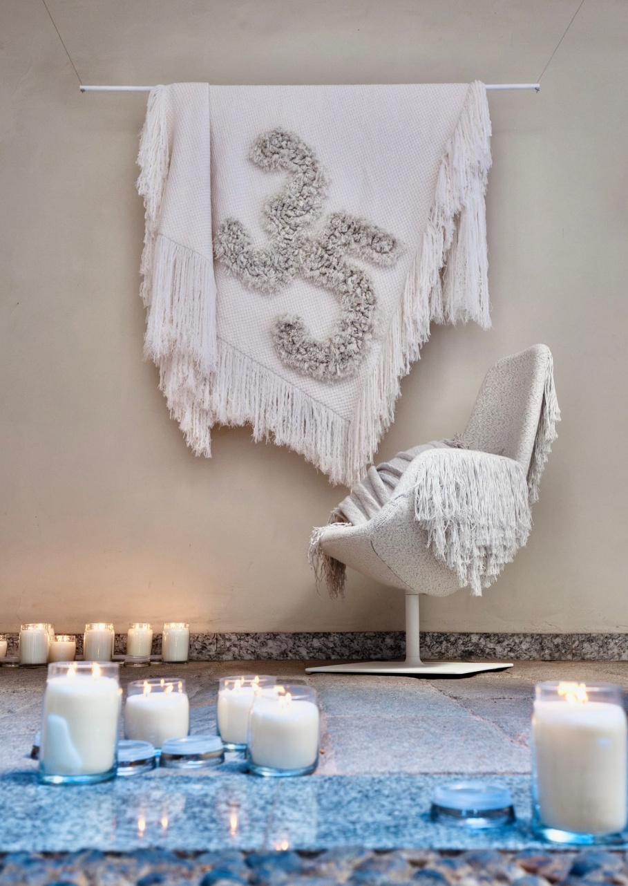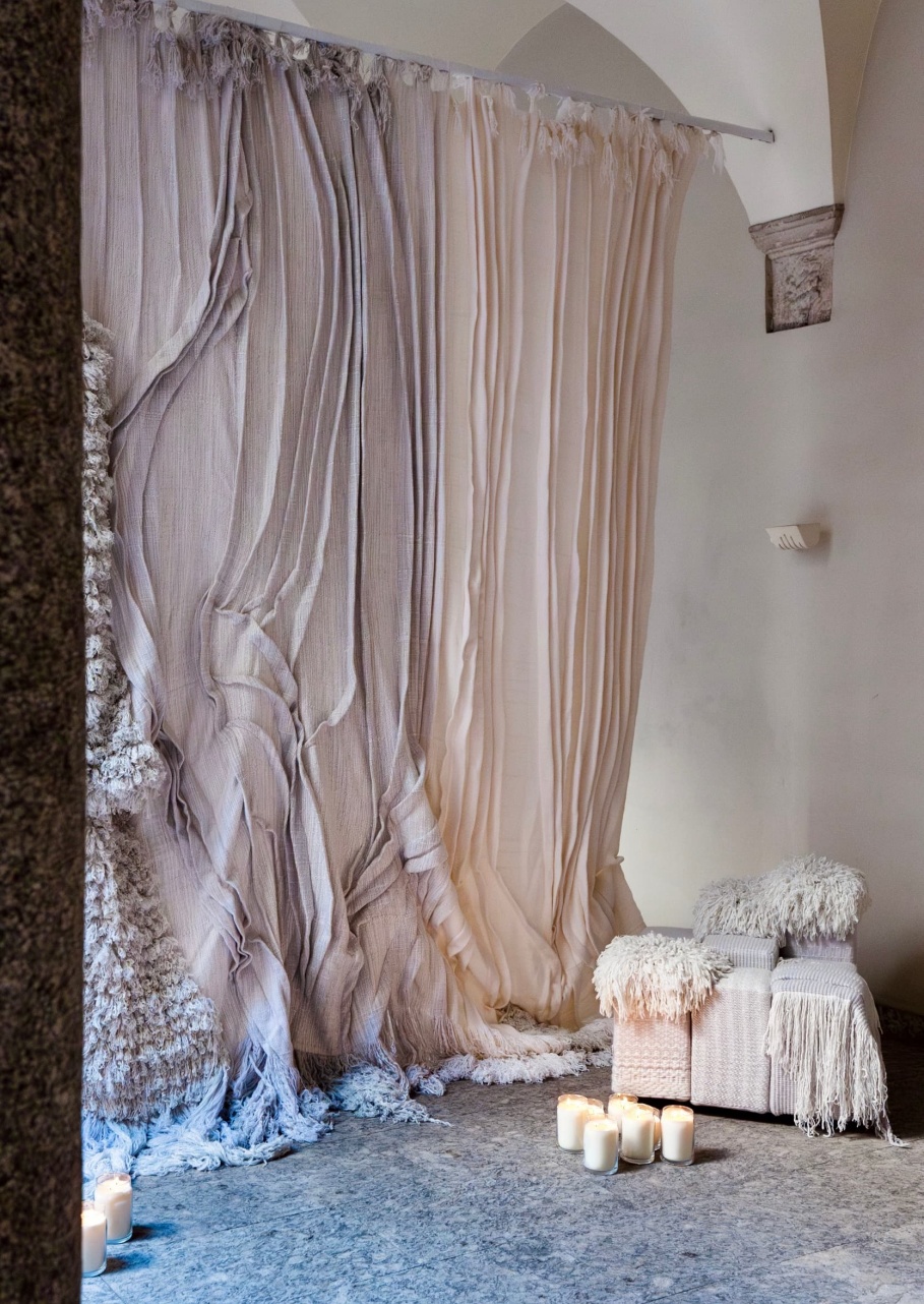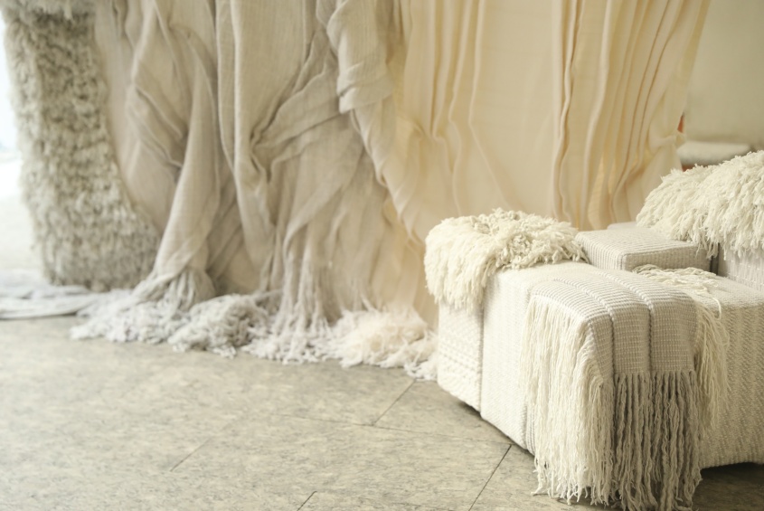 展品以顶级羊绒纱线为核心媒介,依托立体针法打造融合三维浮雕与雕塑语言的家居艺术作品;在视觉呈现上,采用潘通 2026 年度色“云上舞白”为主色调,致敬“新挂毯”运动先驱 Jagoda Buić,通过巨型壁毯、大型盖毯、座椅、靠垫等系列作品,构建出静谧且富有张力的沉浸式纤维艺术空间。