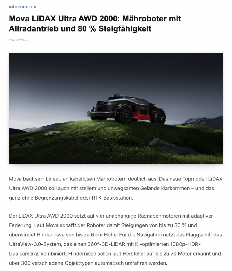 针对不同市场需求,MOVA构建了完整的产品矩阵:ViAX系列全球首创AI双目视觉技术,精准识别300余种障碍物;LiDAX Ultra AWD系列搭载3D激光雷达与全轮驱动系统,轻松应对80%坡度的复杂地形;NAVAX AWD系列融合星基RTK技术,实现无网环境下的厘米级定位。无论是小型庭院还是大型庄园,MOVA都能提供定制化的智能割草方案,让用户彻底告别繁琐的人工操作。