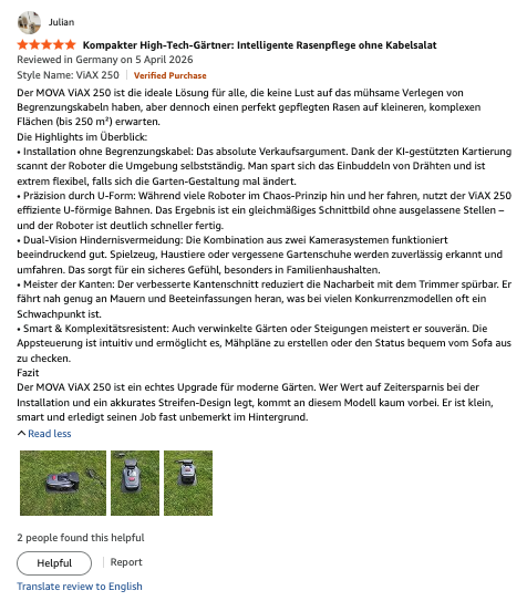 市场的真实反馈是检验产品力的最佳标尺。在亚马逊等海外主流电商平台上,MOVA割草机器人累计收获超多用户高分评价,成了“真第一”最直接的注脚。德国用户在购买MOVA ViAX 250后评价道:“两个摄像头系统的组合效果令人印象深刻。玩具、宠物或被遗忘的花园鞋都能被可靠识别和避开。这在有孩子的家庭中尤其能提供安全感。同时割草均匀、无遗漏区域,机器人完成工作的速度要快得多。”