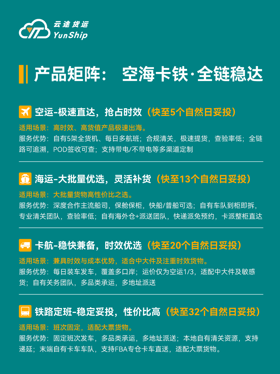 云途货运围绕不同货型、时效与成本需求,推出四大核心头程产品,支持一对一定制化解决方案: