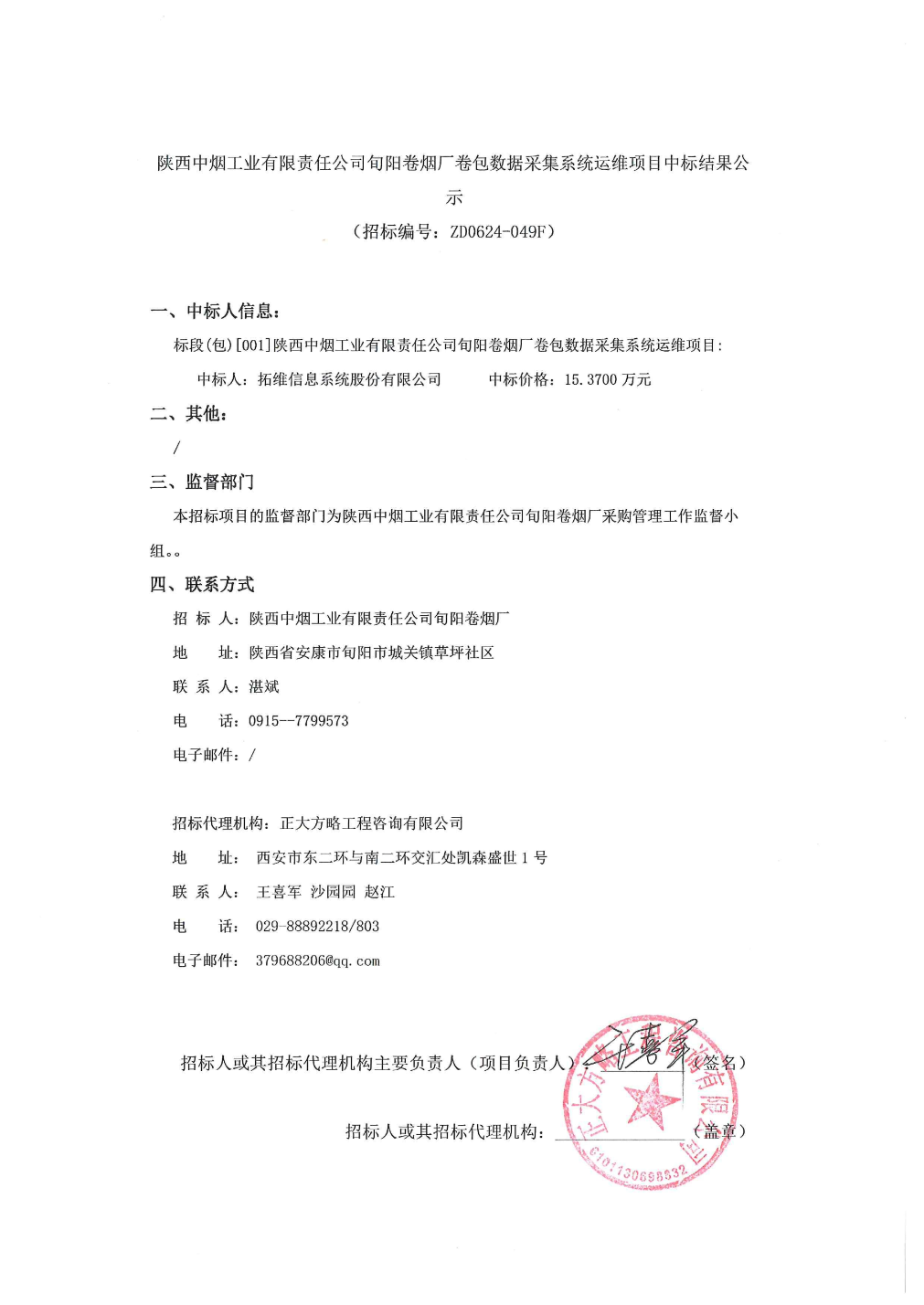 证券之星消息,根据天眼查APP信息整理,9月5日公布的《陕西中烟工业有限责任公司旬阳卷烟厂卷包数据采集系统运维项目中标结果公示》中显示拓维信息系统股份有限公司中标。公告内容如下: