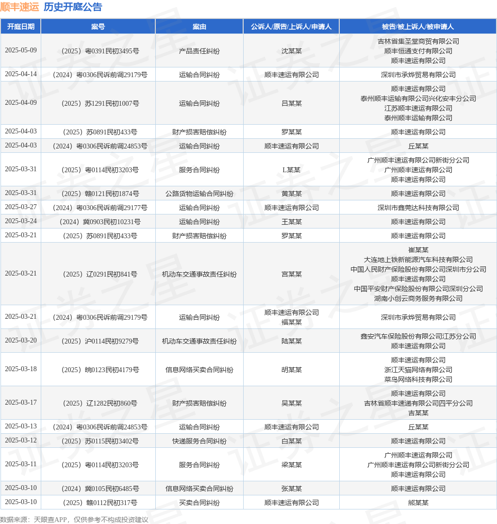 案号:(2025)辽0291民初841号根据统计,近一年内以顺丰速运有限公司为当事人的历史开庭公告有175则,其中案由为“运输合同纠纷”的公告以61则居首,其次为“快递服务合同纠纷”有30则,“机动车交通事故责任纠纷”有17则。历史开庭公告(前20条)如下: