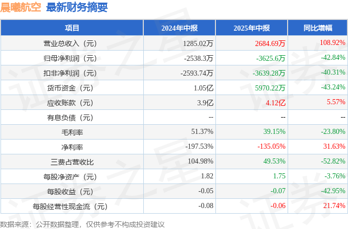 据证券之星公开数据整理,近期晨曦航空(300581)发布2025年中报。截至本报告期末,公司营业总收入2684.69万元,同比上升108.92%,归母净利润-3625.6万元,同比下降42.84%。按单季度数据看,第二季度营业总收入2355.19万元,同比上升104.3%,第二季度归母净利润-2104.72万元,同比下降103.82%。本报告期晨曦航空公司应收账款体量较大,当期应收账款占最新年报营业总收入比达292.98%。